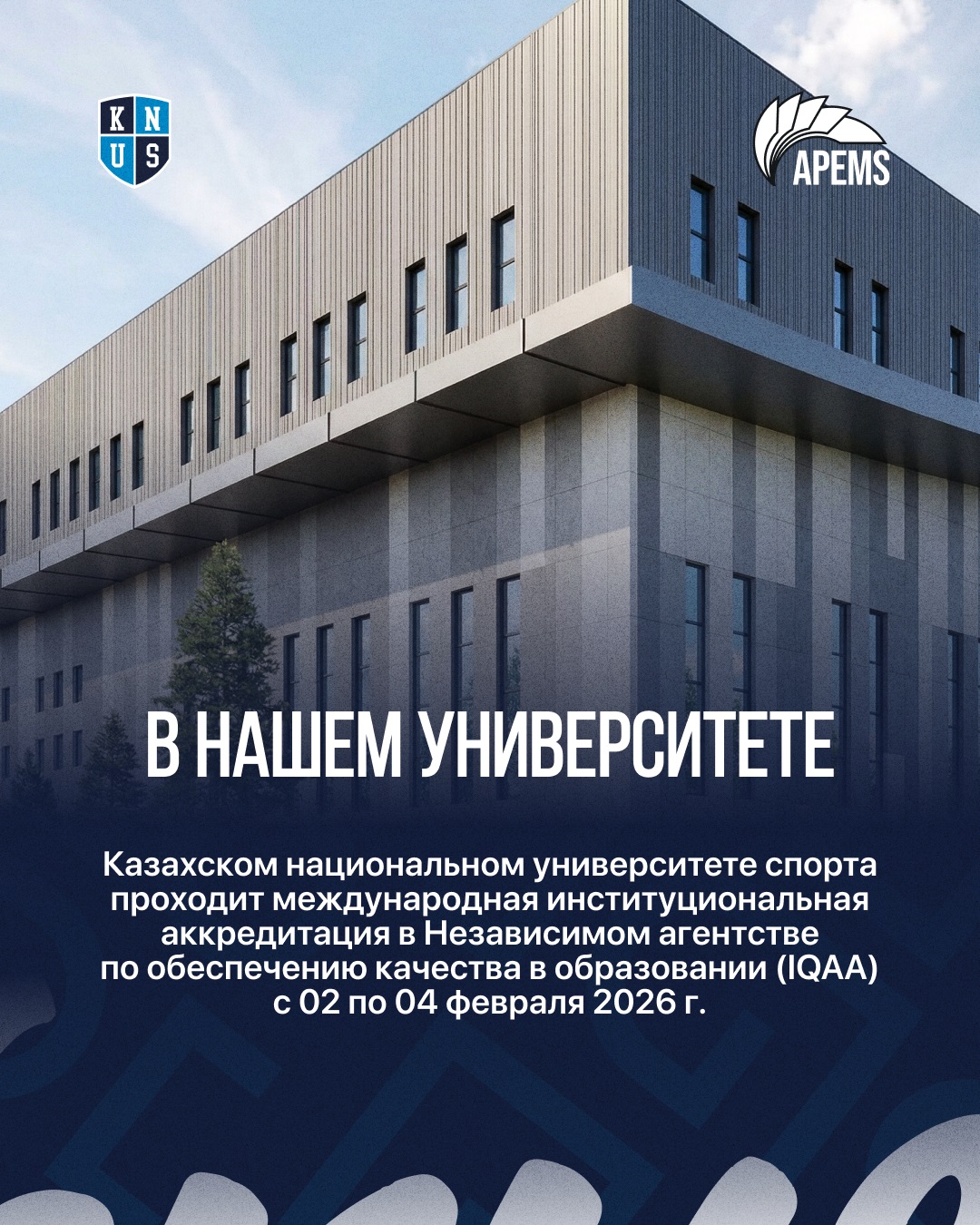 В нашем университете, Казахском национальном университете спорта проходит международная институциональная аккредитация в Независимом агентстве по обеспечению качества в образовании (IQAA) с 02 по 04 февраля 2026 г.