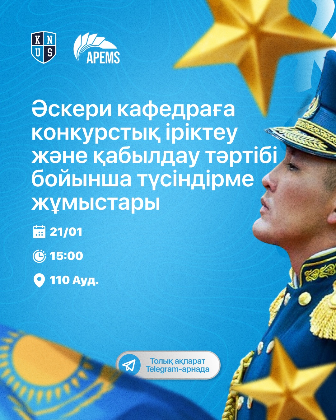 Әскери кафедраға конкурстық іріктеу және қабылдау тәртібі бойынша түсіндірме жұмыстары өткізіледі.