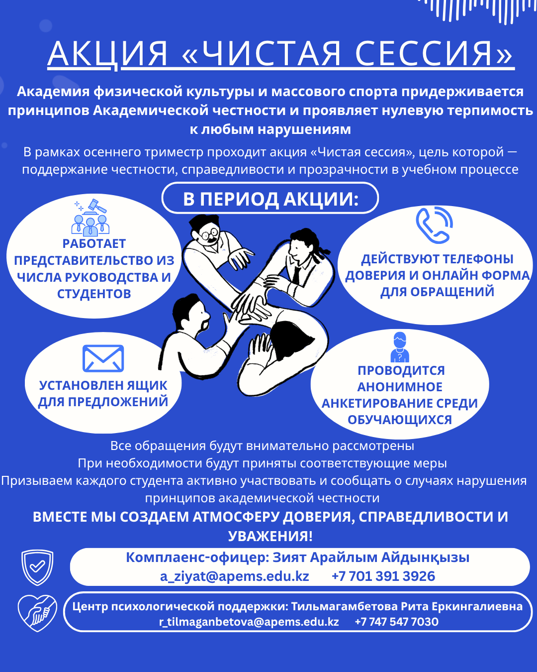 В связи с этим, в период осеннего триместра, напоминаем о проведении акции «Чистая сессия» (далее-Акция). В рамках акции оперирует представительство из числа руководства и обучающихся Академии, работают телефоны доверия, функционирует ящик и онлайн форма для предложении, пожеланий и замечаний. Также будет проводиться анонимное анкетирование среди обучающихся в конце триместра. Результаты акции будут тщательно рассмотрены и приняты соответствующие решения, при необходимости. Соответственно, просим активно принять участие в данной акции и сообщать в случаях нарушения принципов Академической честности.